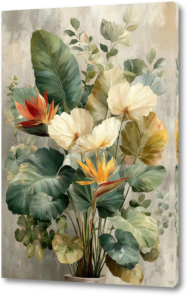 Картина с тропическим мотивом, в современной манере — подойдёт как для классического, так и для современного интерьера. Отлично впишется в гостиную, спальню, кабинет или зону отдыха, привнося в пространство нотку уюта и тропического тепла.