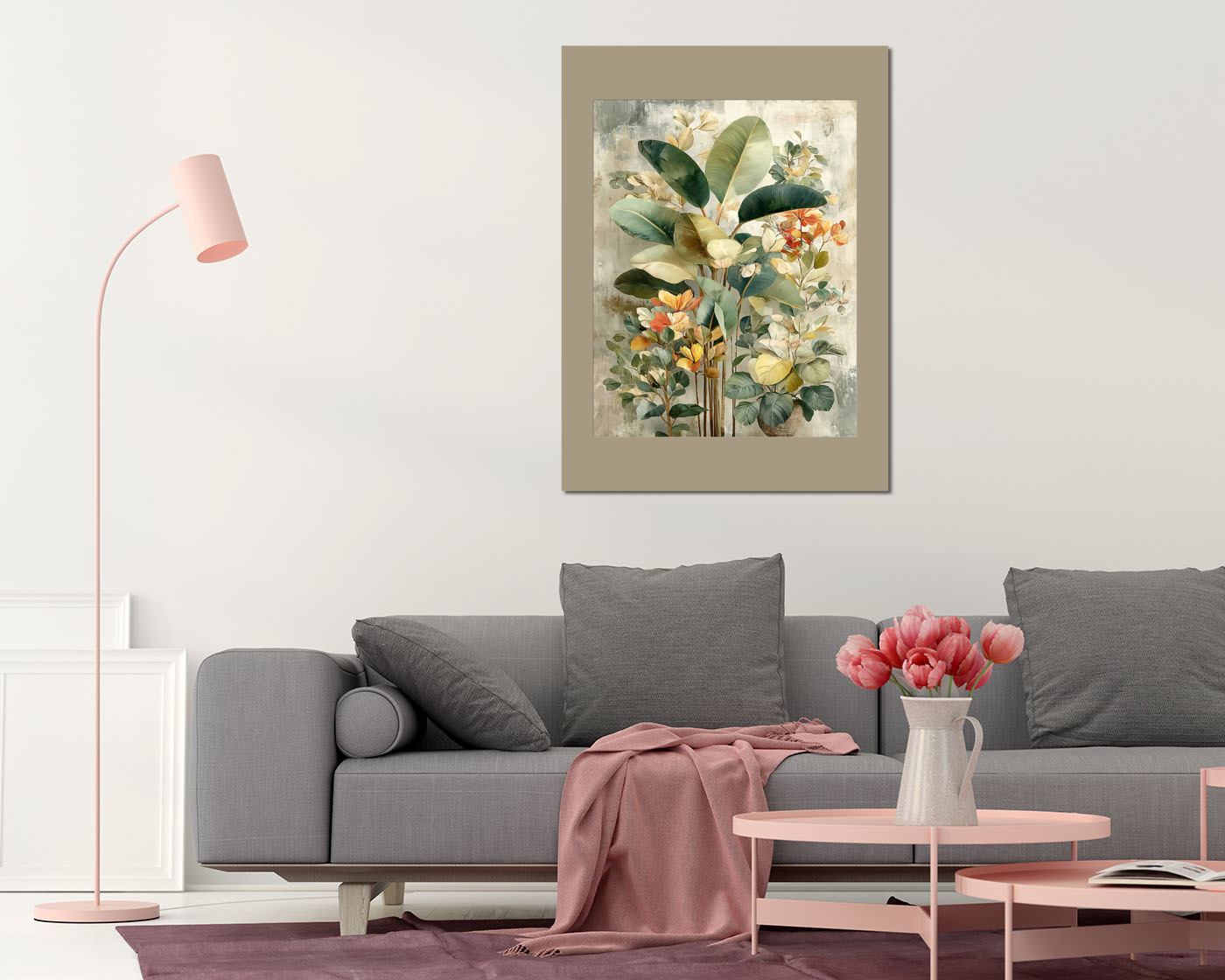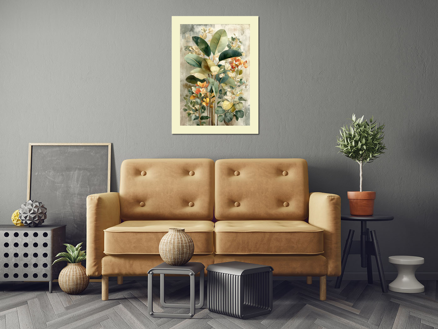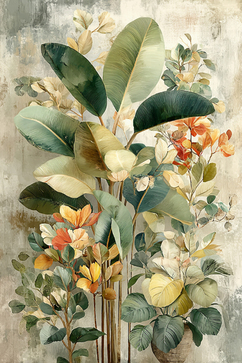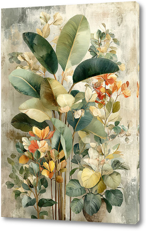 Картина с экзотической флорой — сочетание зелёных, жёлтых и оранжевых оттенков для создания уютной атмосферы.