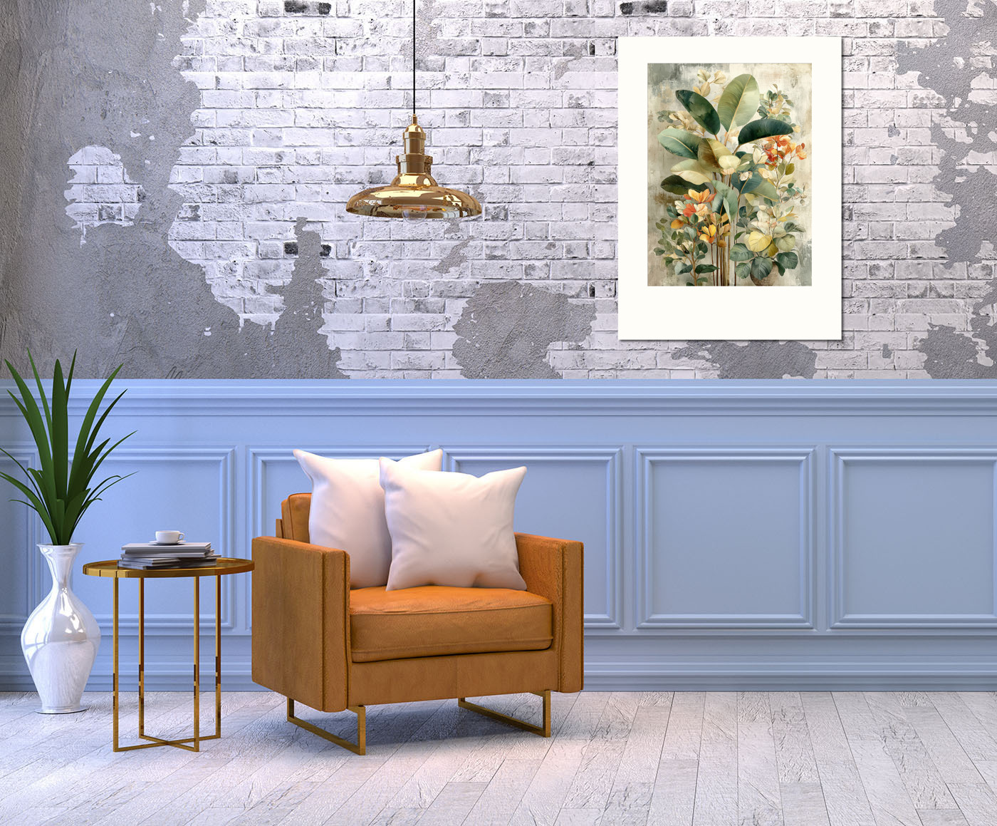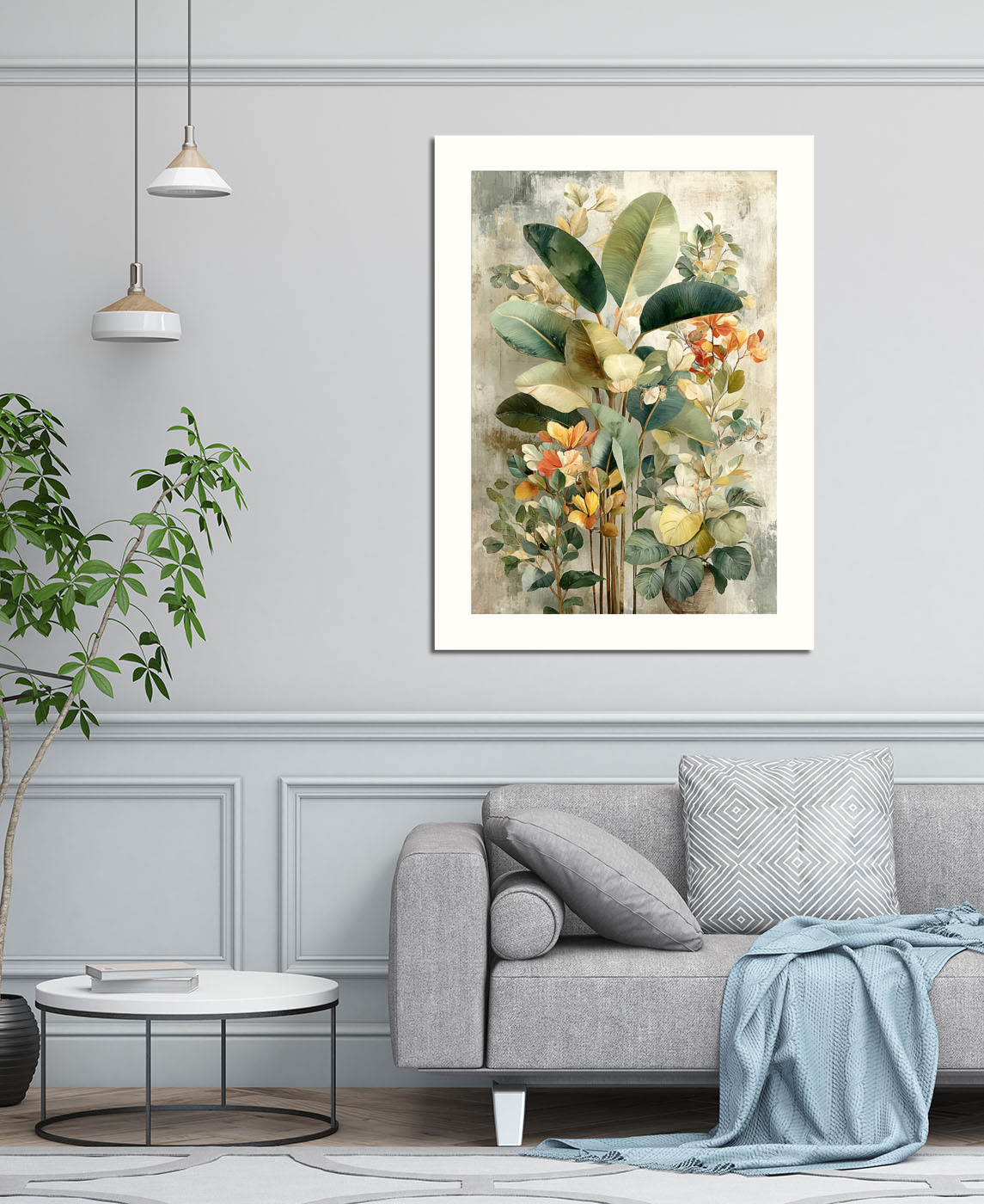 Картина с экзотической флорой — сочетание зелёных, жёлтых и оранжевых оттенков для создания уютной атмосферы.