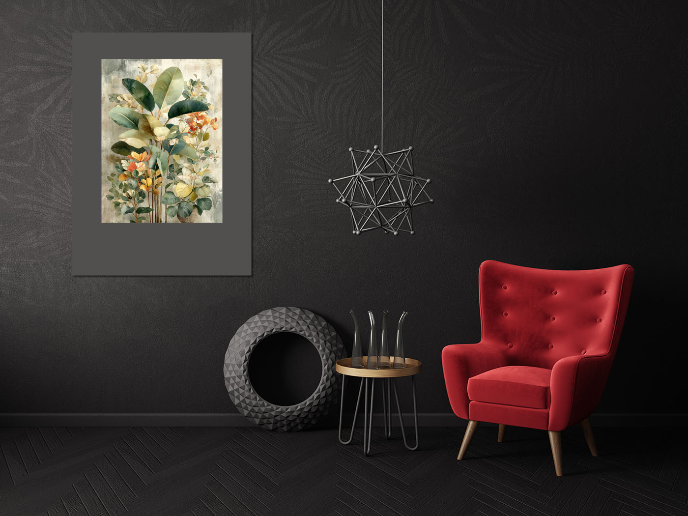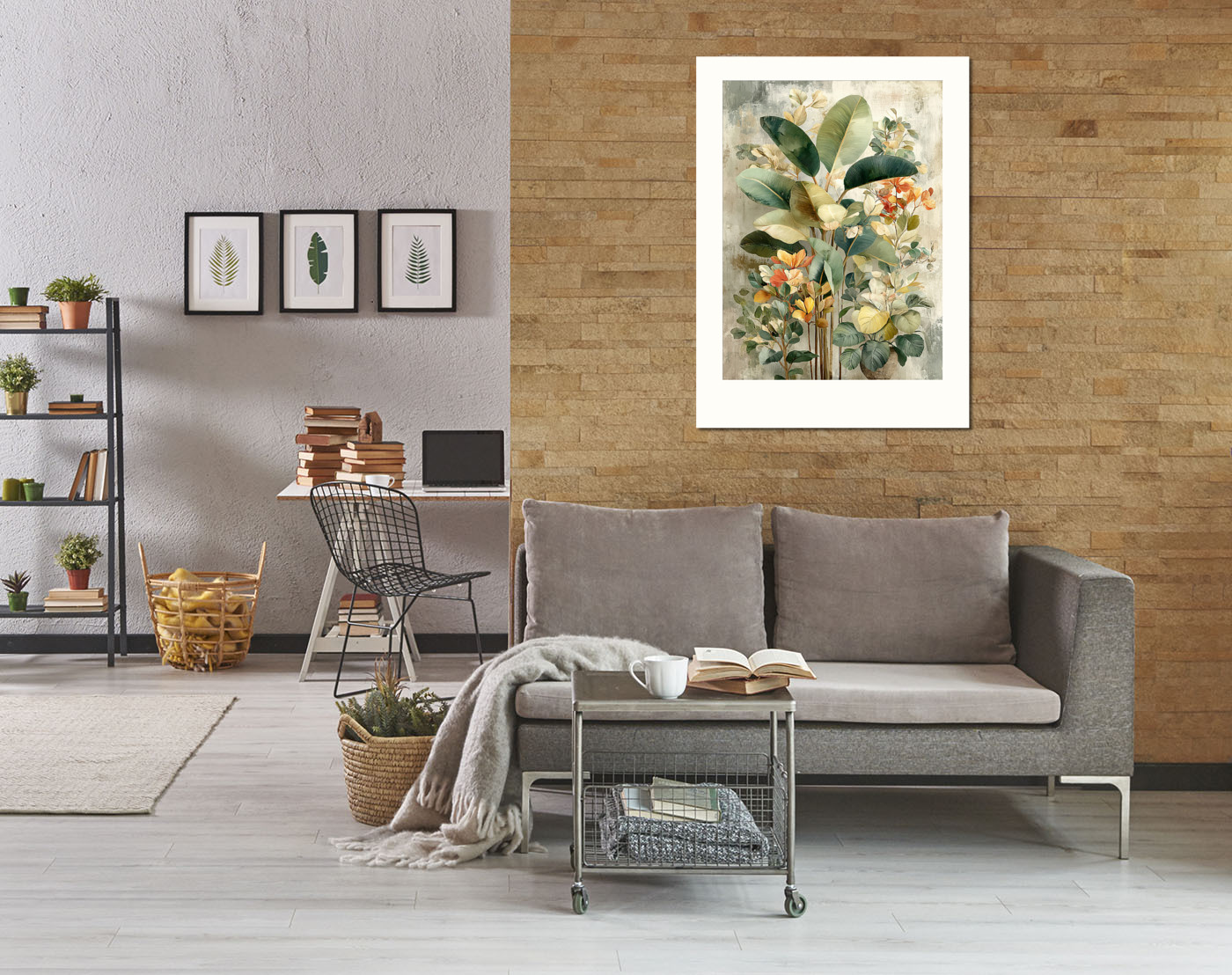 Картина с экзотической флорой — сочетание зелёных, жёлтых и оранжевых оттенков для создания уютной атмосферы.
