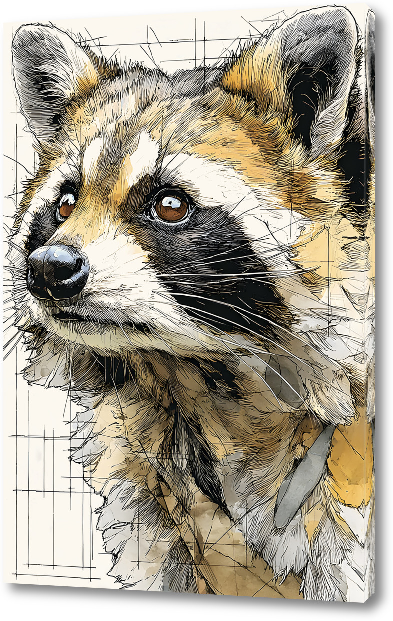 Художественный рисунок енота с акцентом на выразительность взгляда. Техника сочетает графику и акварельные пятна — стильно и оригинально. Прекрасный подарок или элемент декора.