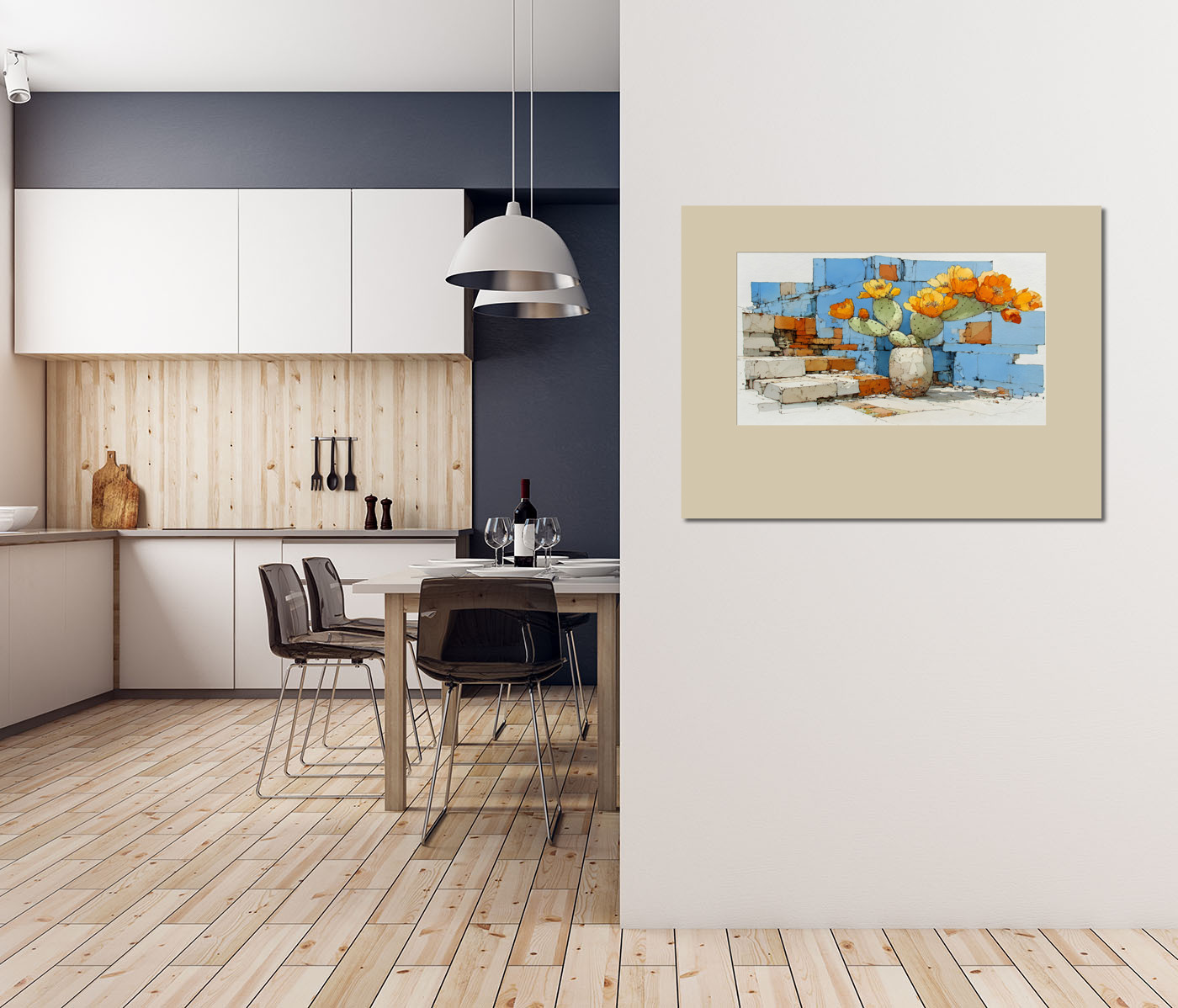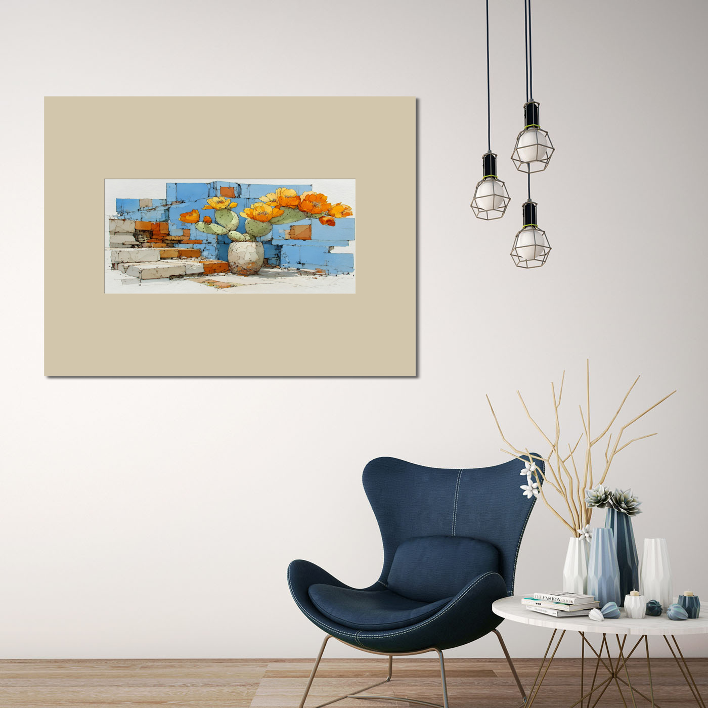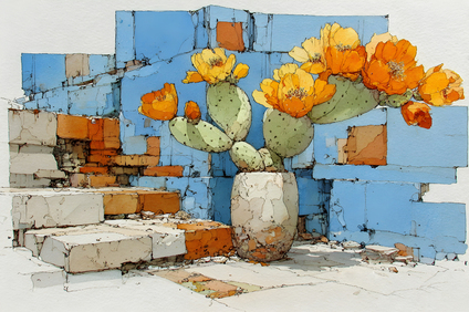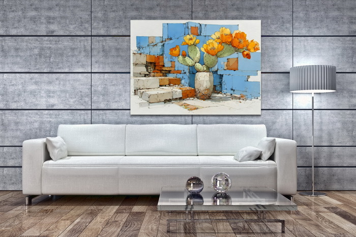 Композиция с цветущим кактусом в массивной вазе на фоне абстрактной кирпичной стены в сине-оранжевых тонах. Сочетание природной нежности и урбанистической геометрии создаёт интересный акцент для декора кафе, галереи или домашнего пространства.