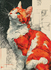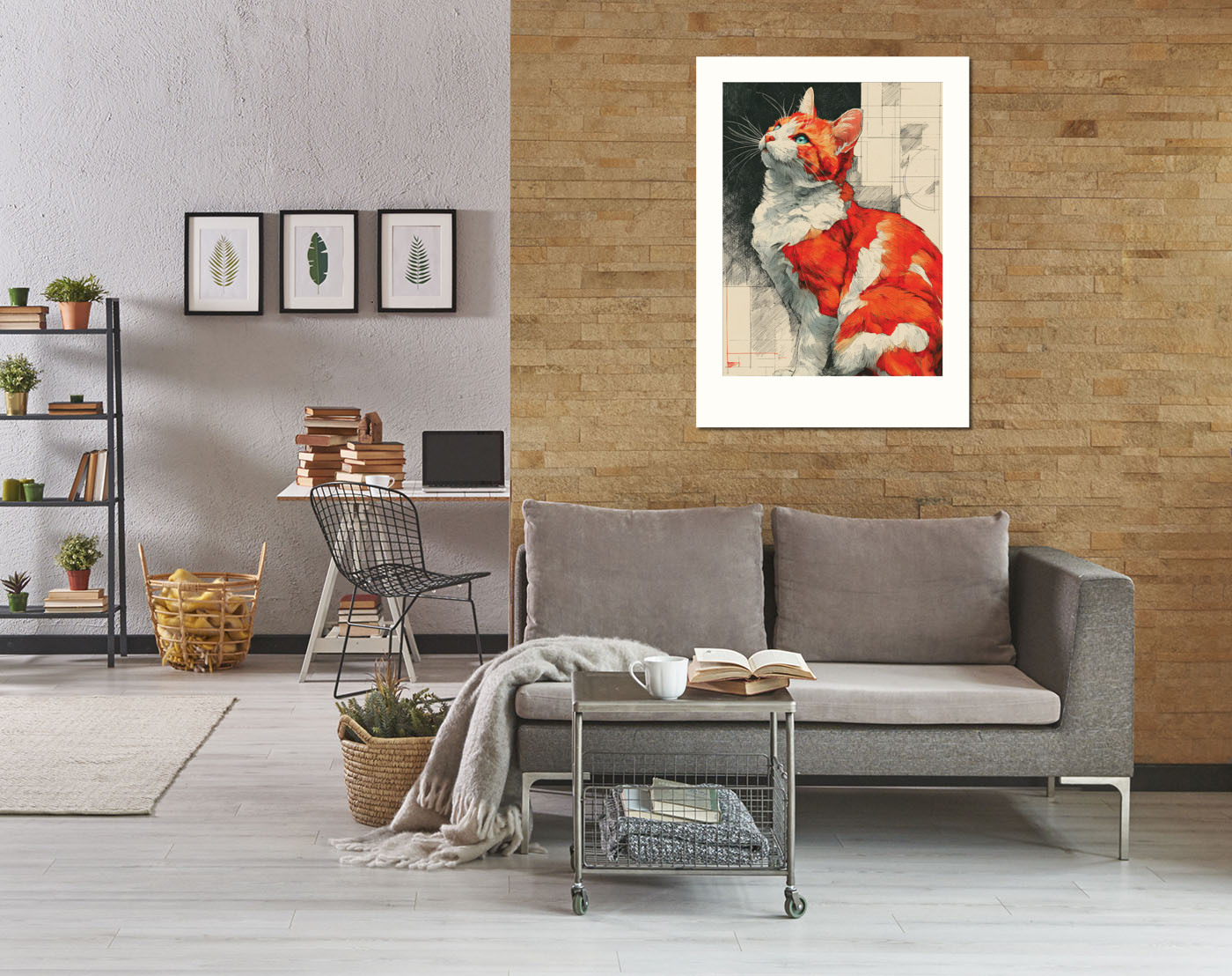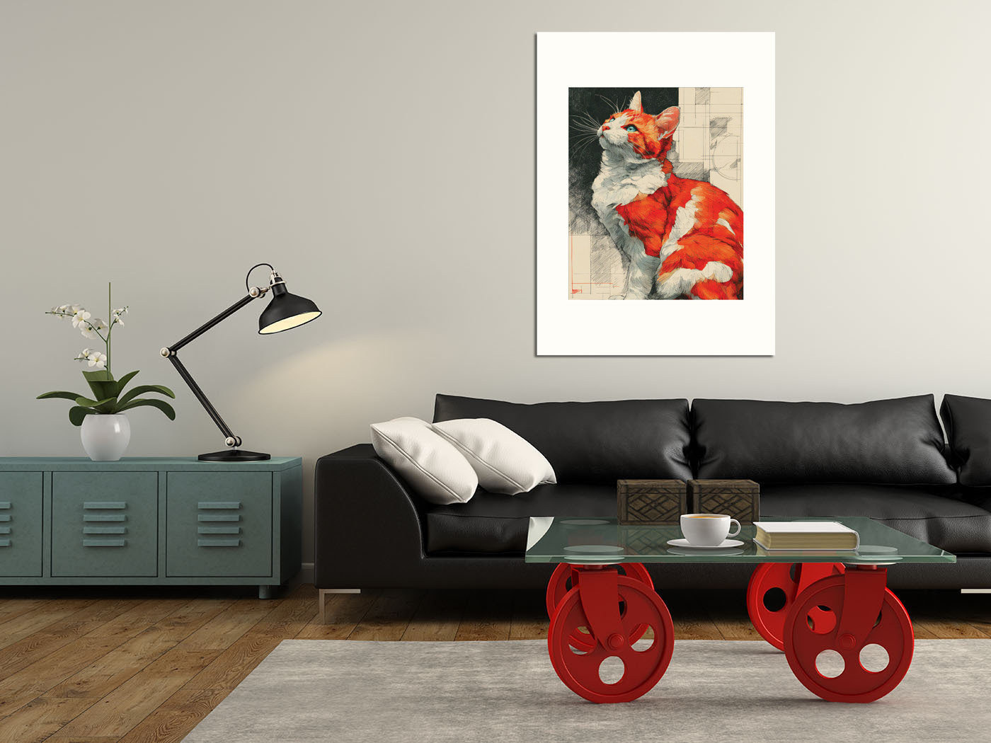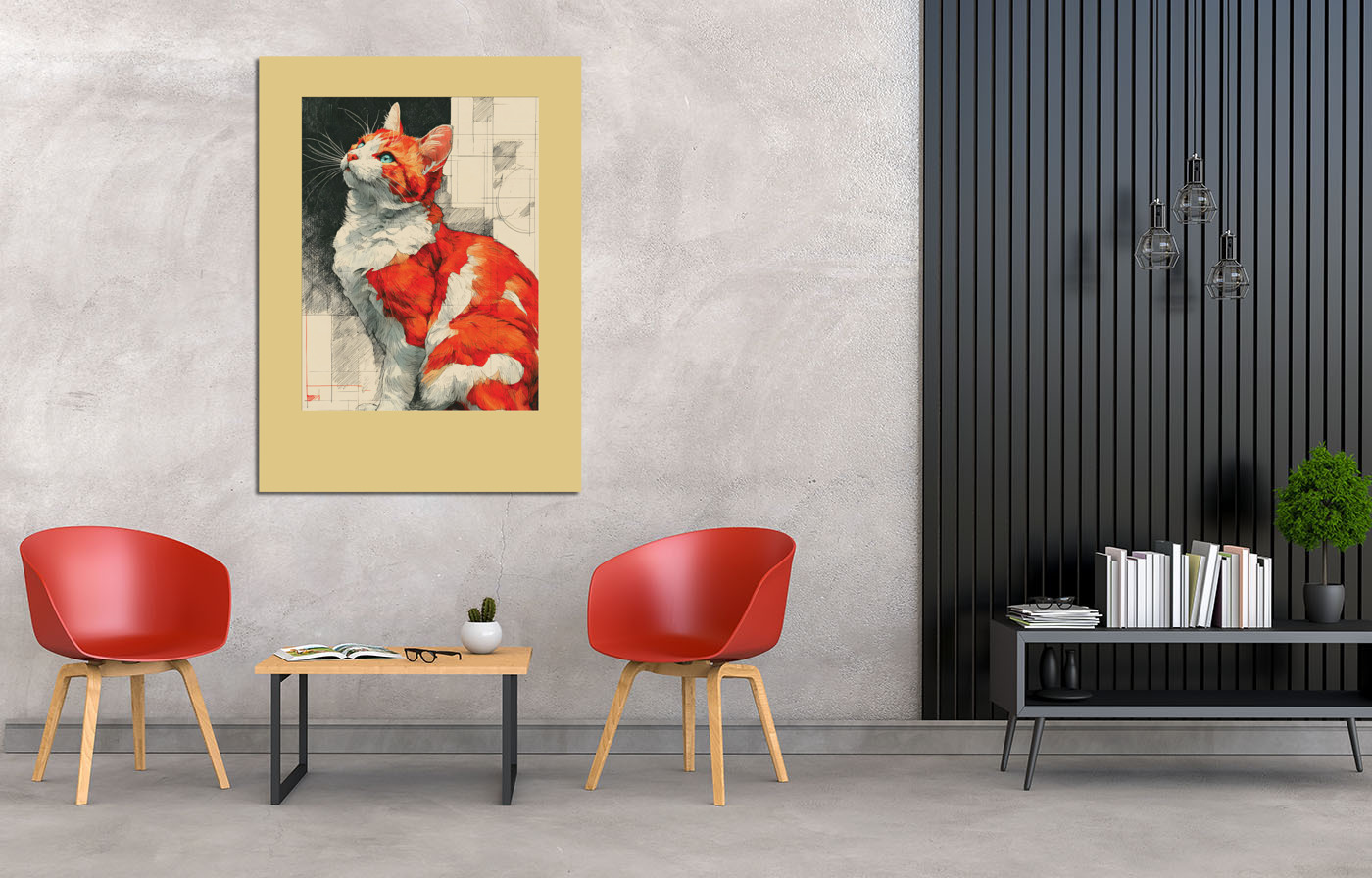 Арт-портрет рыже-белой кошки с выразительными голубыми глазами. Сочетание графики и цветных акцентов, динамичный фон с геометрическими линиями — стильный акцент для интерьера.
