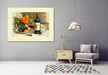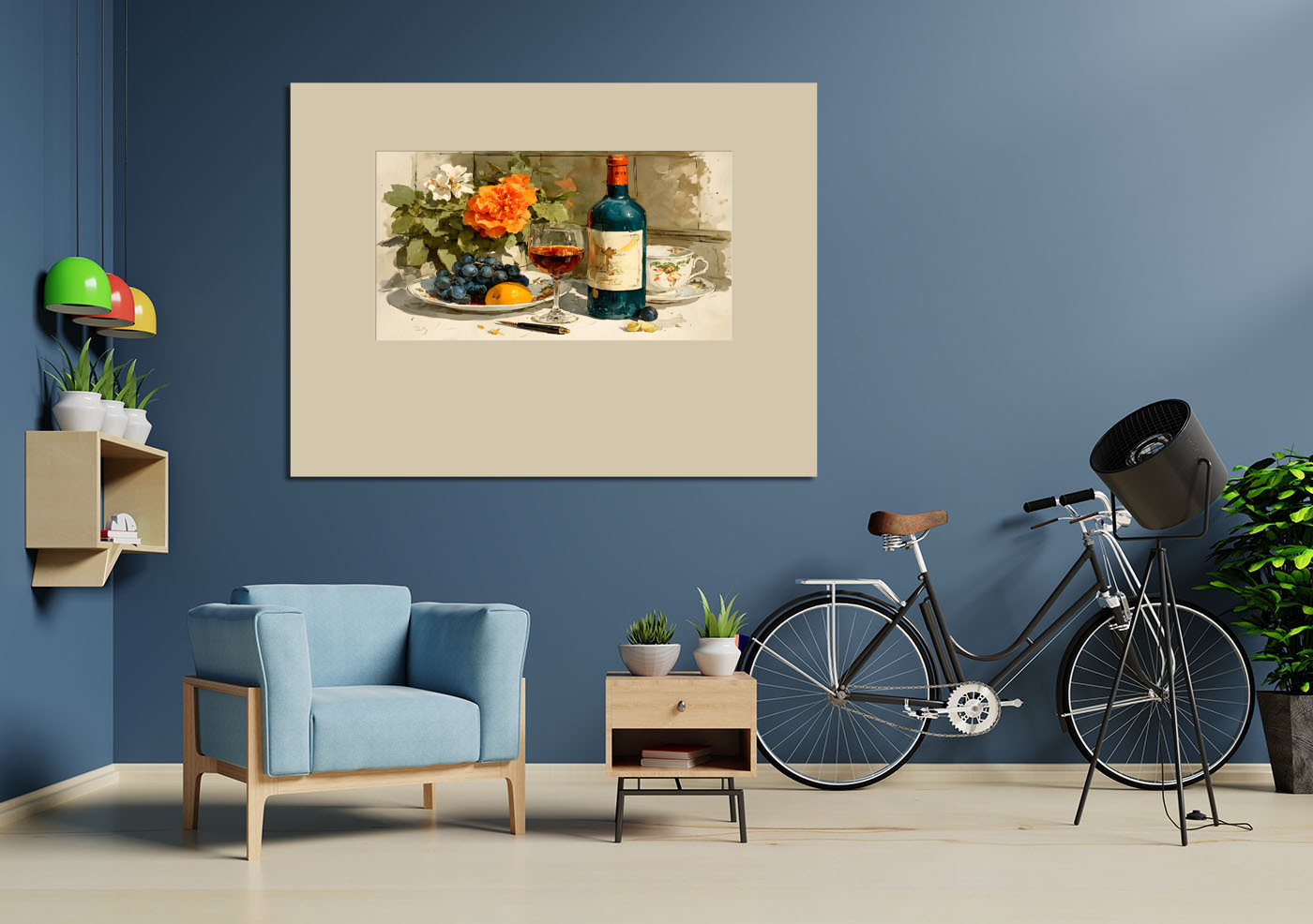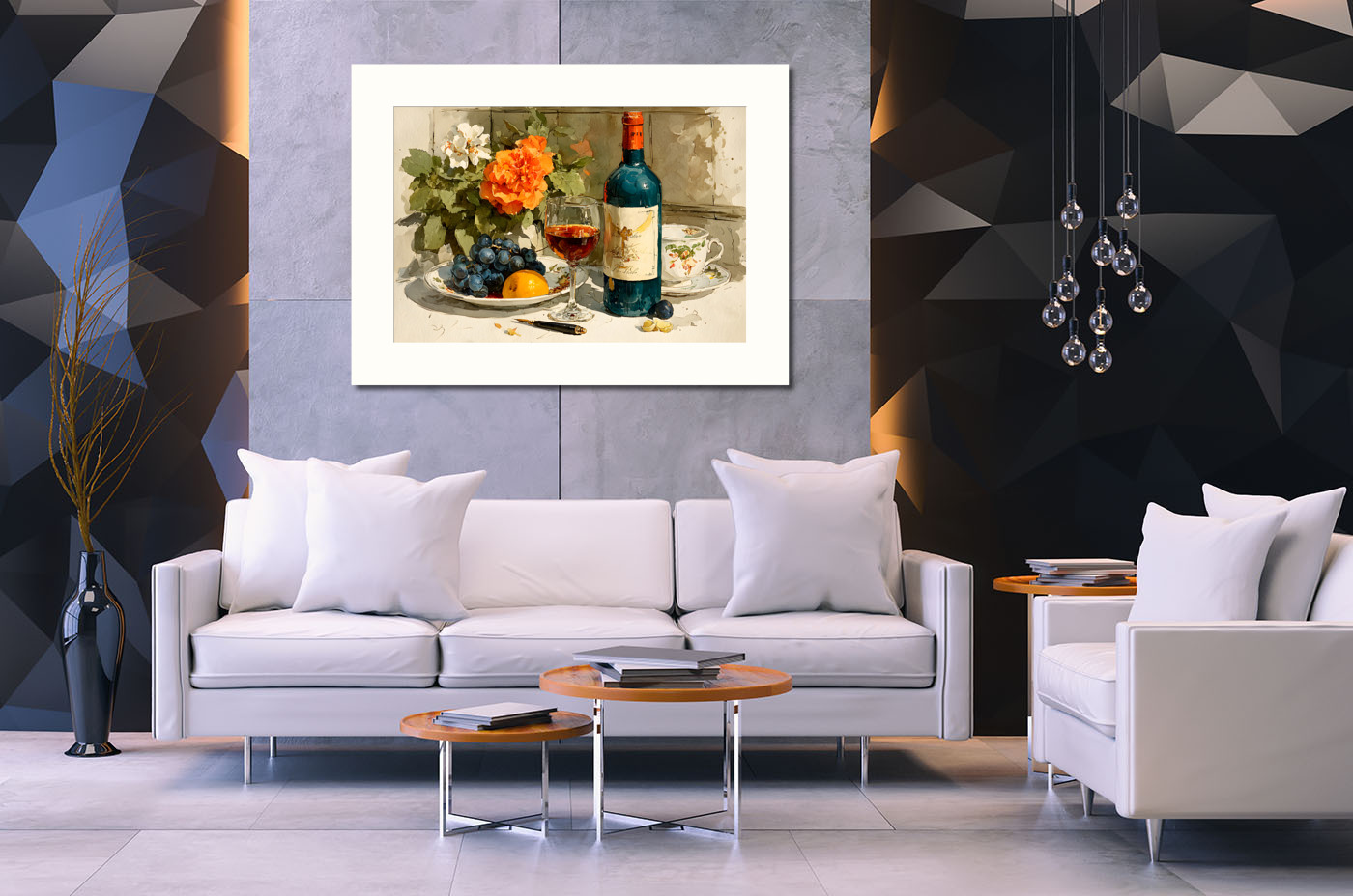 Натюрморт с вином, виноградом и цветами в теплых тонах, атмосферная и уютная композиция для украшения кухни столовой или гостиной.