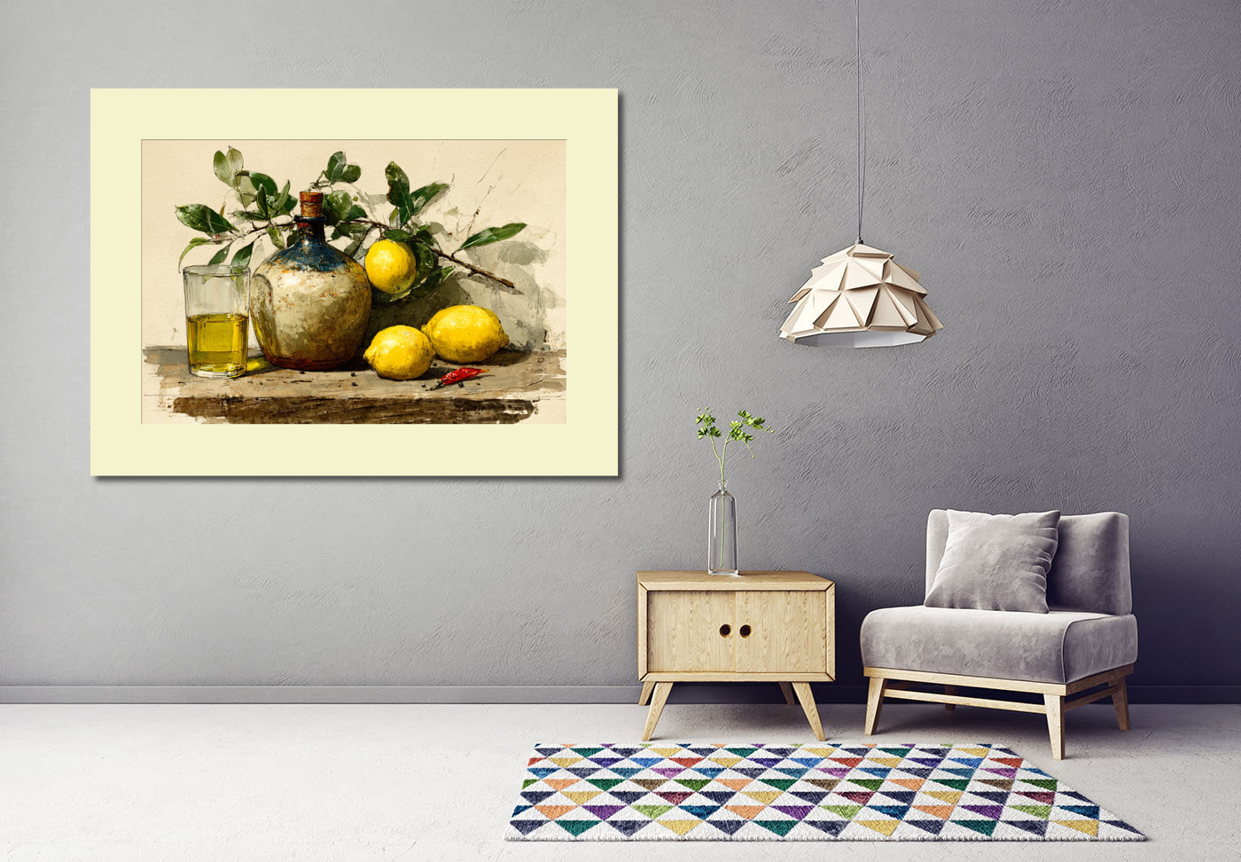 Средиземноморский натюрморт: на деревянной поверхности гармонично соседствуют потёртая керамическая бутылка с пробкой, стакан с золотистым оливковым маслом, три сочных лимона, веточка зелёных листьев и яркий стручок красного перца. Тёплые жёлтые и зе
