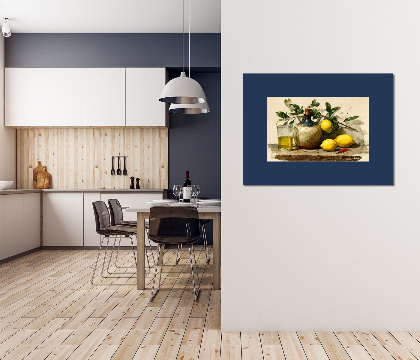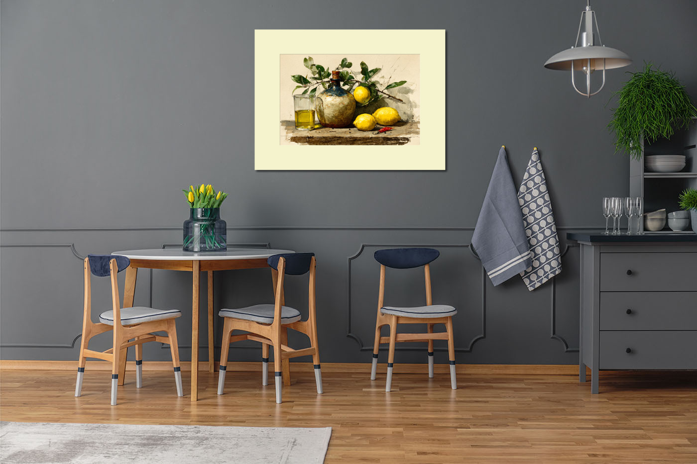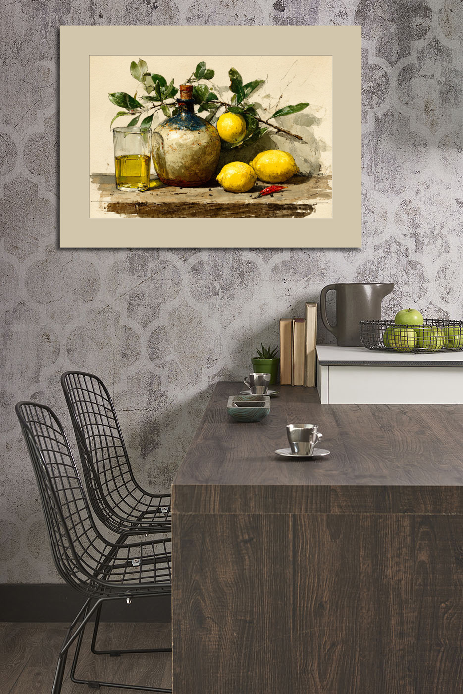 Средиземноморский натюрморт: на деревянной поверхности гармонично соседствуют потёртая керамическая бутылка с пробкой, стакан с золотистым оливковым маслом, три сочных лимона, веточка зелёных листьев и яркий стручок красного перца. Тёплые жёлтые и зе