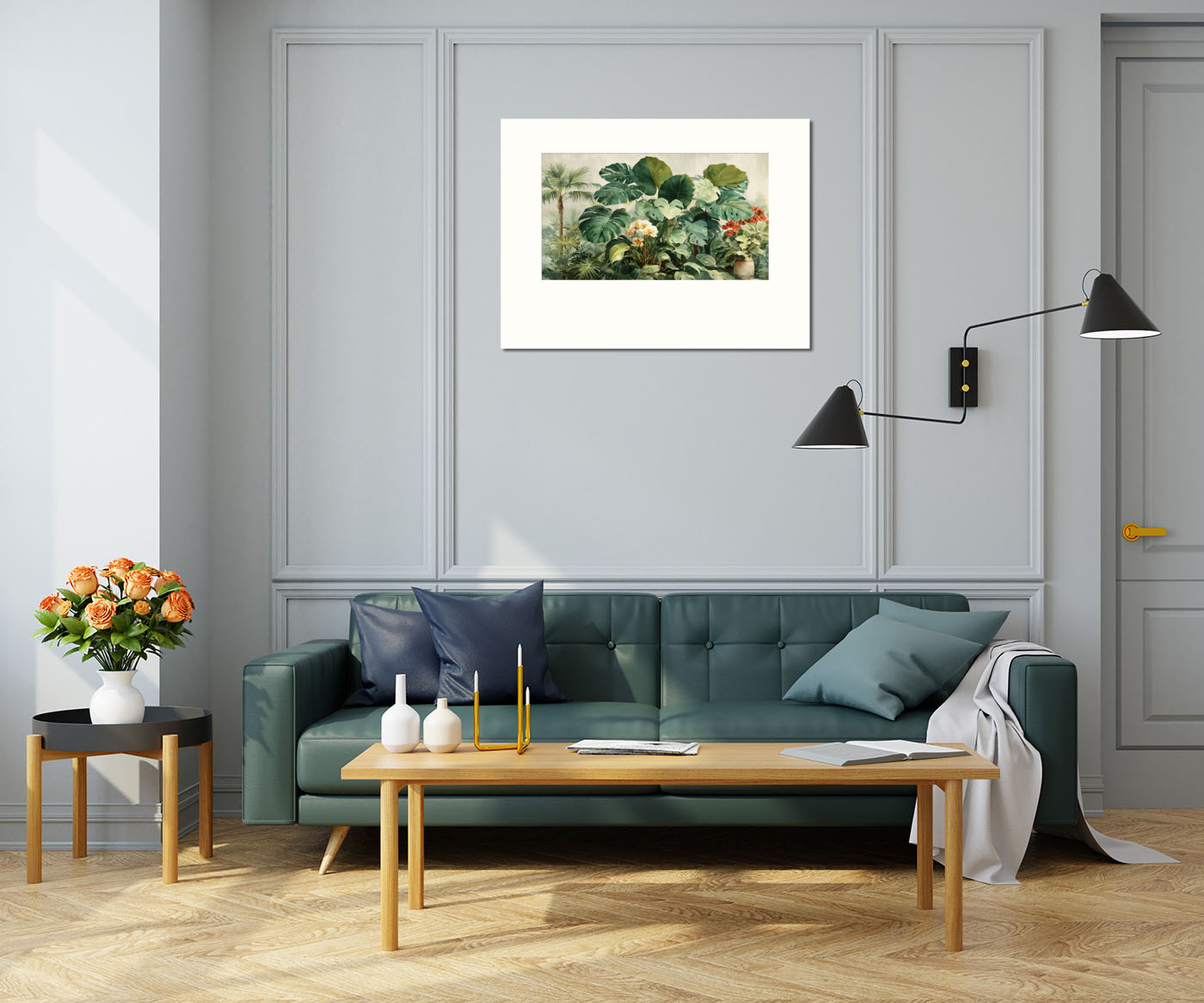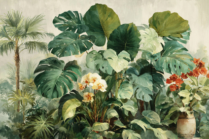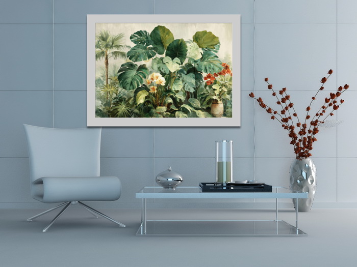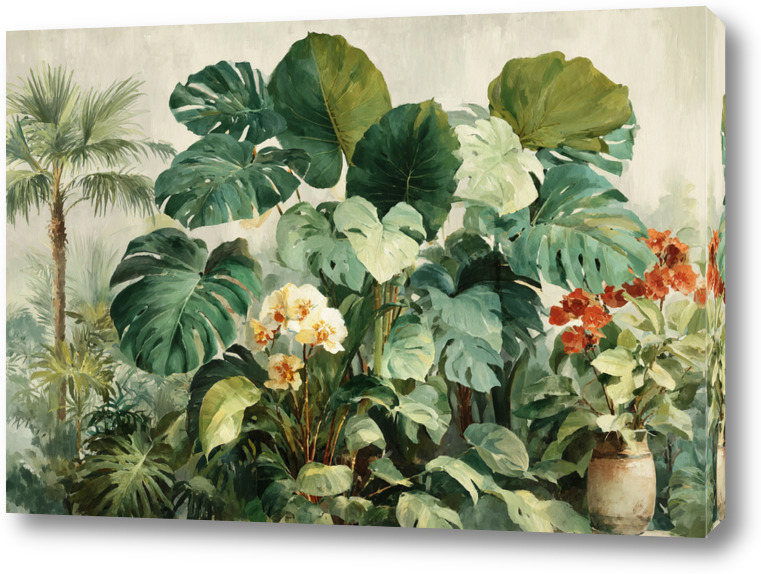 Картина с экзотической растительностью — монстера, пальма, орхидеи. Сочная зелёная палитра оживит любое пространство.