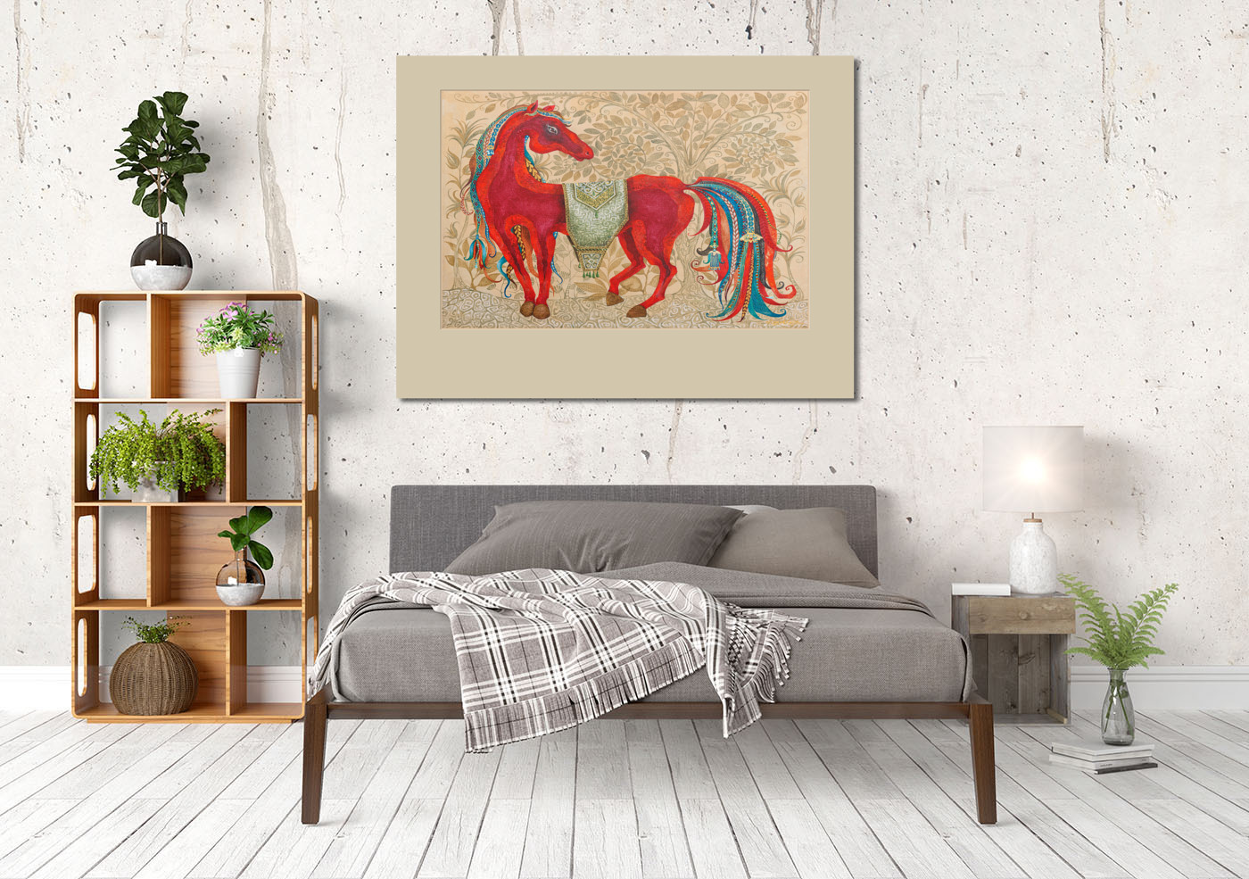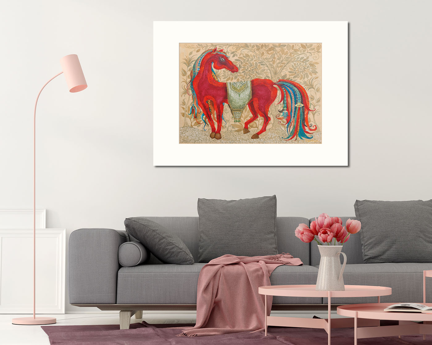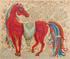 Это картина изображает грациозную огненно-красную лошадь на фоне изящного орнаментального древа жизни. Работа выполнена на холсте акрилом в декоративной авторской технике с элементами орнаментальной росписи