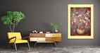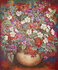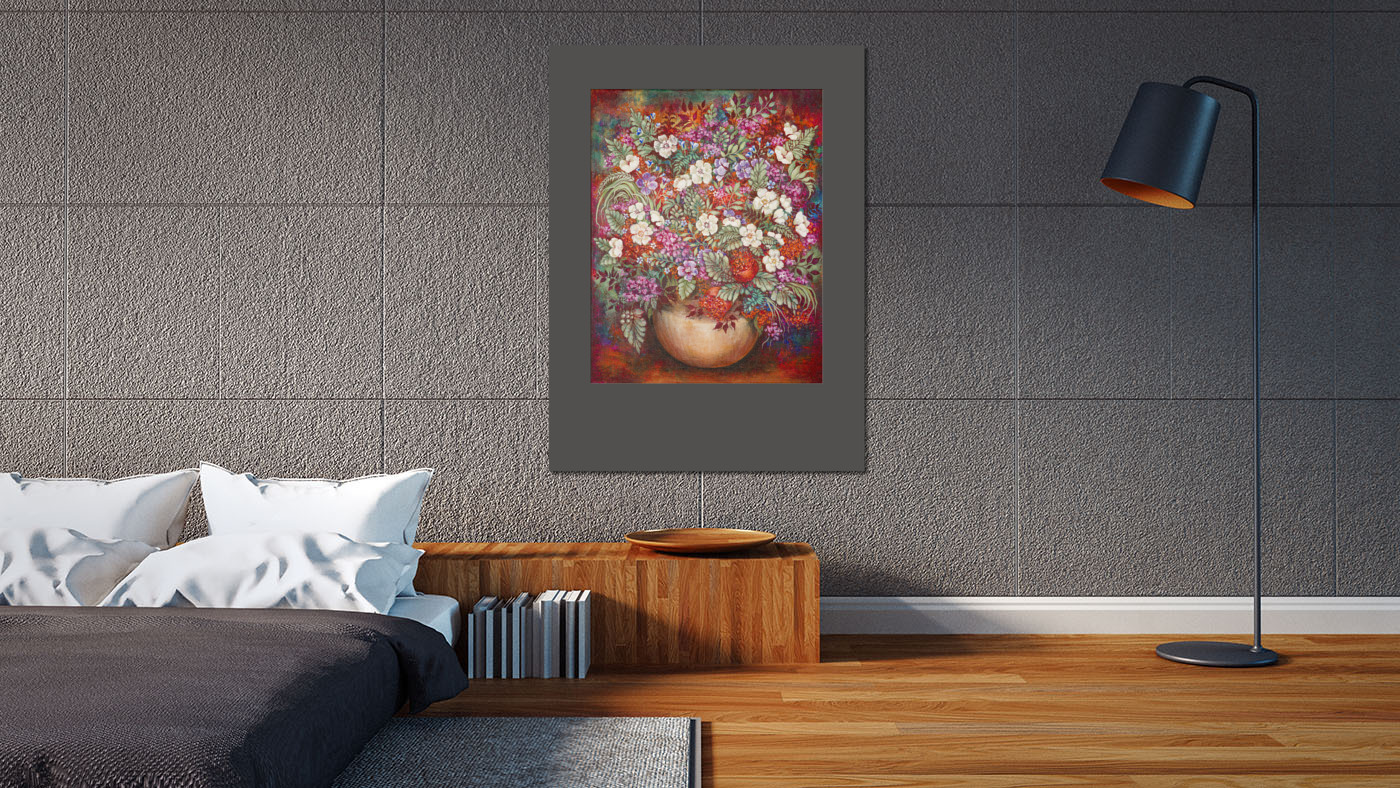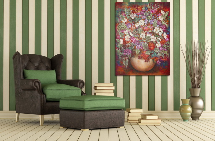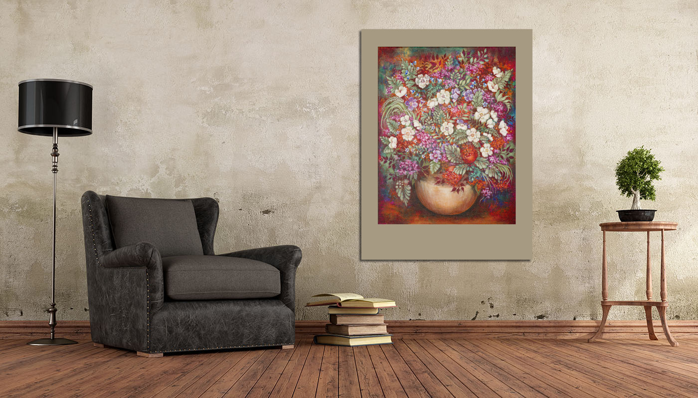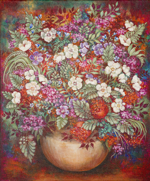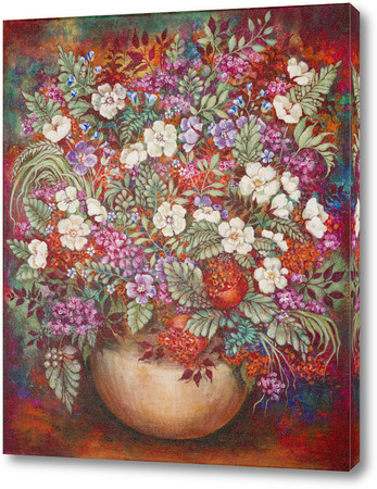 На картине изабражен пышный букет осенных цветов в глинаной вазе. Она передает настроение щедрой осени ,гармонию природы и ощущение тепла и уюта.Картина исполненна на холсте акрилом